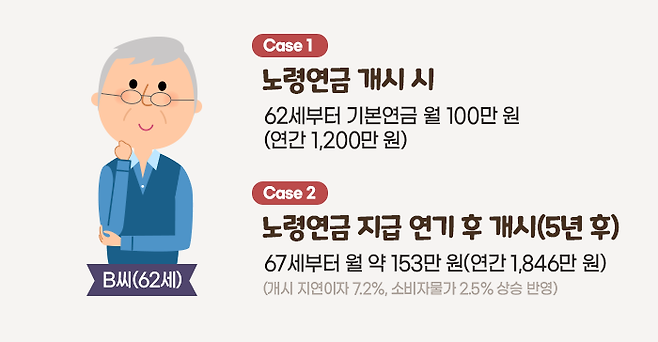 62세인 B씨는 올해부터 노령연금을 수령할 수 있습니다. 올해 노령연금을 개시하면 기본연금으로 월 100만 원(연간 1,200만 원)을 받을 수 있는데, B씨는 5년을 늦춰 67세부터 수령하려고 합니다. 매년 소비자물가는 2.5%씩 상승할 것으로 예상됩니다.