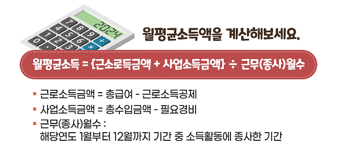 소득을 산출할 때는 각종 비용을 공제해 줍니다. 근로소득을 산출할 때는 총급여에서 근로소득공제액을 빼주고, 사업소득을 산출할 때는 총수입금액에서 필요경비를 차감해 줍니다. 이렇게 산출한 소득금액을 당해 연도 근무(종사)월수로 나눠서 월평균소득을 산출합니다.
