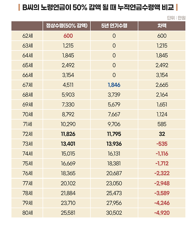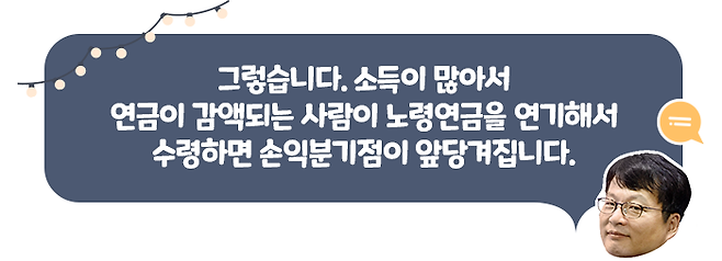 앞서 B씨가 소득이 있는 업무에 종사해서 정상적으로 연금을 수령하면 연금액이 50% 감액된다고 해보겠습니다. 이 경우 B씨가 연금 수급 시기를 5년 뒤로 연기하면, 손익분기점은 73세로 앞당겨집니다.