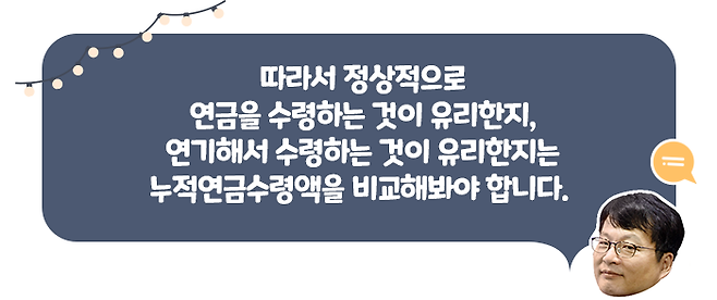 물론 장점만 있는 것은 아닙니다. 노령연금은 살아 있는 동안 받을 수 있기 때문에, 수급 시기를 뒤로 미룬 만큼 수령 기간이 줄어듭니다. 연금을 더 받는 대신 수급 기간이 줄어드는 겁니다.