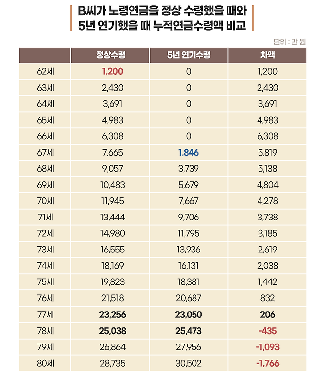 아래 표는 B씨가 62세부터 노령연금을 받을 때와 67세로 연기하여 받았을 때 누적연금수령액을 비교한 것입니다. 77세까지는 정상 수령했을 때 누적연금수령액이 더 많은 것을 볼 수 있습니다.