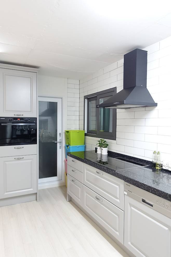 머리에 쥐가 나도록 고민하던 끝에 기존 주방 구조, 특히 수납을 위해 팬트리를 그대로 유지하면서 과감하게 상부장을 없앴습니다.