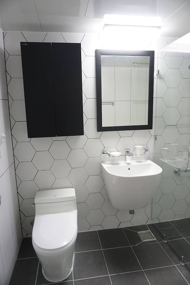 그래서 거실 화장실은 화이트 헥사곤 타일과 화이트 직사각형 타일을 베이스로 블랙 줄눈을 넣었고, 수납장 & 거울은 블랙으로 했어요.