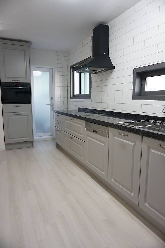 그래서 신경 쓴 것이 마루 색상(동화자연마루 나투스진 퓨어실버)이었습니다. 주방의 그레이 컬러와 어울리면서도 기존의 원목 가구와도 조화를 이루어야 했으니까요.