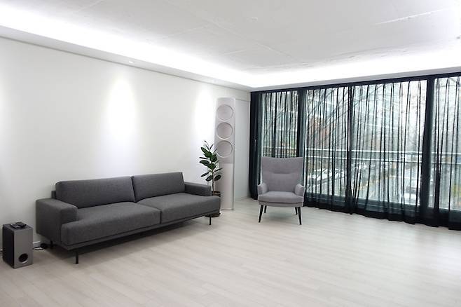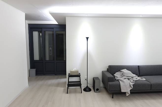거실은 가족 전체의 휴식공간으로 만들고 싶었어요. 이전 집에서는 거실에 테이블과 책장이 있었기 때문에 거실은 아이들 책방이자 공부방이었습니다. 그런데 TV가 안방에 있다 보니 아이들이 자연스럽게 TV를 안 보게 된다는 장점은 있었지만, 부부 간 좋아하는 프로그램이 달라서 TV 시청 때문에 수면방해가 되더라고요.