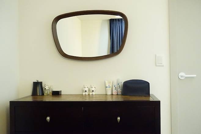 안방가구들이 다크초콜릿에 가까운 어두운 월넛 컬러이기 때문에 너무 밝은 원목거울은 이질감이 느껴졌겠지만 이 거울은 디자인이 독특하면서도 색감도 기존 가구들과 크게 이질감이 느껴지지 않았어요. (단, 디자인이 독특하다 보니 수평으로 달기가 생각보다 쉽지 않아서 설치가 쉽지 않았다는 건 비밀 ^^;)
