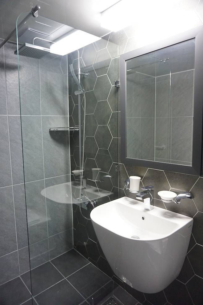 저는 한 면만 헥사곤 타일로 하고 나머지 면은 직사각형의 큰 타일로 시공했습니다. 작은 타일로 시공할 경우 시간이 많이 걸리기 때문에 인건비가 올라갑니다. 예산 내 시공을 위해 한 면만 헥사곤 타일로 하는 대신 나머지 면을 비교적 시간이 적게 걸리는 직사각형의 큰 타일로 시공하는 걸로 합의한 거죠.