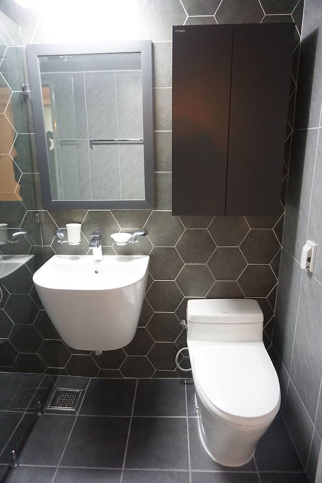 그래서 거실 화장실은 화이트 헥사곤 타일과 화이트 직사각형 타일을 베이스로 블랙 줄눈을 넣었고, 수납장 & 거울은 블랙으로 했어요.
