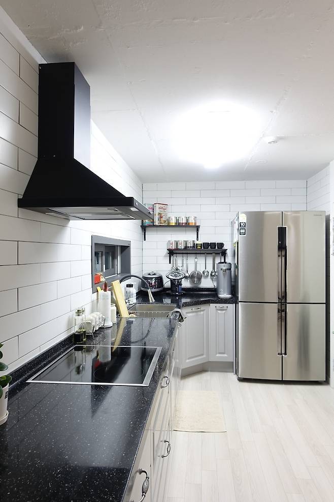 머리에 쥐가 나도록 고민하던 끝에 기존 주방 구조, 특히 수납을 위해 팬트리를 그대로 유지하면서 과감하게 상부장을 없앴습니다.