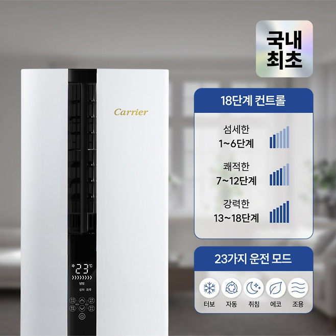 에어컨 명가 캐리어에서 출시된 2025년형 창문형 에어컨이다. 전면 흡입구와 측면 토출구를 분리시킨 특허 받은 디자인으로, 토출 냉기를 다시 흡입하지 않아 짧은 시간에도 효율적인 냉방이 가능하다. 또한 창문형 에어컨임에도 18단계로 섬세한 풍량 조절이 가능하며, 1단계의 경우 최저 소음 32dB로 진동이나 소음 걱정 없이 쾌적하게 사용할 수 있다. 상하좌우 슈퍼 와이드 냉방으로 사각지대 없이 고르게 냉방할 수 있고, 실내 온도에 따른 맞춤형 인버터 운전 방식으로 에너지소비효율이 뛰어나다는 것도 강점.