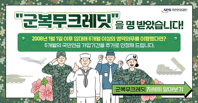 군복무크레딧은 2008년 1월 1일 이후 입대해 6개월 이상의 병역의무를 이행한 사람에게 6개월의 국민연금 가입기간을 추가로 인정해 주는 제도입니다!