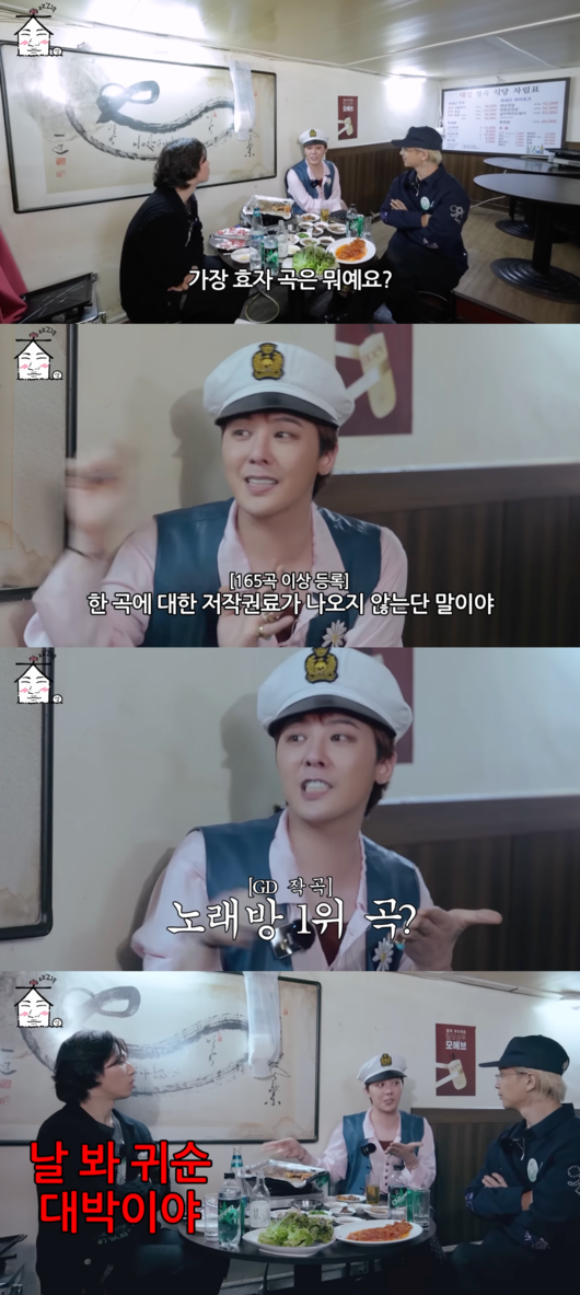 이에 대성은 “저작권에서 가장 효자곡은 뭐냐”고 물었고, 지드래곤은 “매년 쌓이면 한 곡, 한 곡에 대한 것으로 저작권료가 나오는 게 아니다. 전체 수입으로 나오기 때문에 활동 여부에 따라 차이가 있다”고 설명했다.