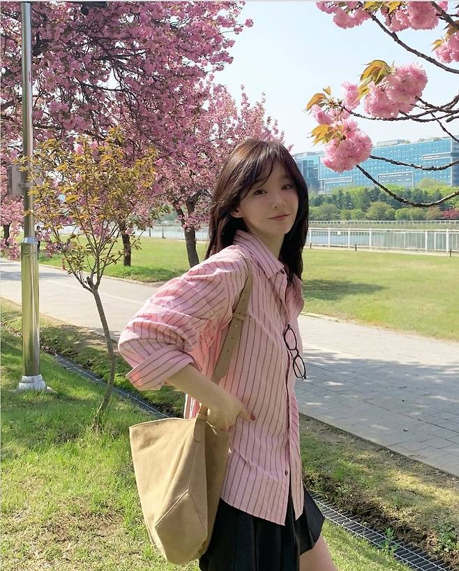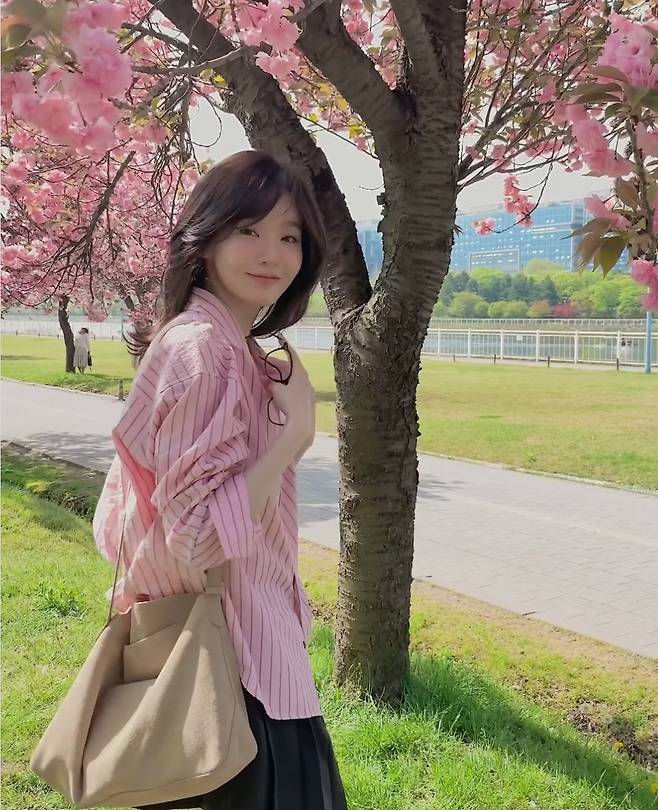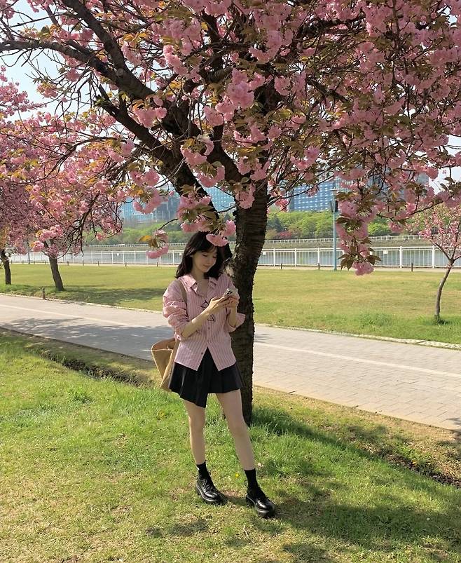 다비치 강민경이 28일 인스타그램에 "겹벚꽃이 만개하던 눈물나게 예쁘던 공원,, 🌸"이라는 글과 함께 여러 장의 사진을 게재했습니다.