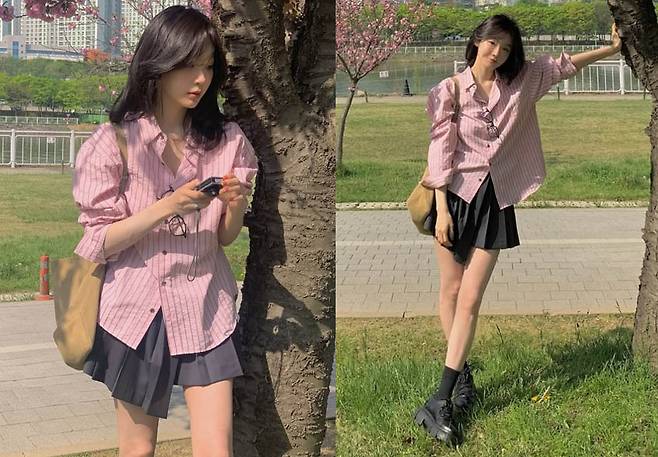 강민경은 핑크 스트라이프 셔츠에 플리츠 미니스커트를 매치해, 청춘 드라마 주인공 같은 풋풋한 스타일을 완성했습니다.