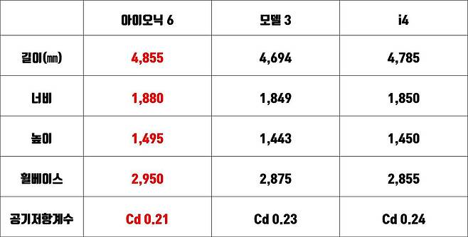 의외인 부분은 공기저항계수다. 수치가 낮을수록 바람 가르는 실력이 좋은데, 통상 중형 세단의 공기저항계수는 Cd 0.25~0.30 안팎이다. 공기저항계수가 낮으면 전기차의 주행거리를 늘리는 데도 도움을 준다. 아이오닉 6는 Cd 0.21, 모델 3는 Cd 0.23, i4는 Cd 0.24로 현대의 승리.