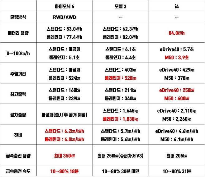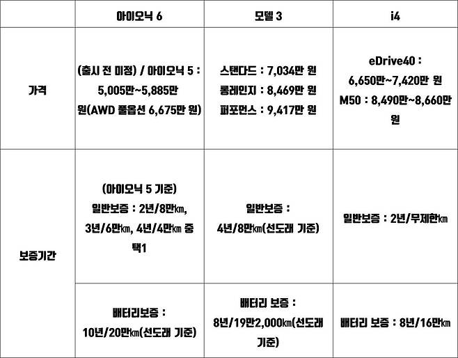 몇 종류 없는 전기 세단. 표로 꼼꼼히 비교해보니, 저마다 각기 다른 개성으로 소비자를 유혹한다. 아이오닉 6는 가장 넉넉한 공간과 뛰어난 전비를 갖췄다. 모델 3는 가볍고 견고한 차체와 우월한 주행거리로 시장 1위다운 제원을 지녔다. i4는 셋 중 주행거리는 짧지만, 가장 뛰어난 주행 퍼포먼스를 뽐낸다. 과연 이들 세 차종 가운데 시장 주도권은 누가 움켜쥘지, 올 하반기 판매 결과에 관심을 모은다.