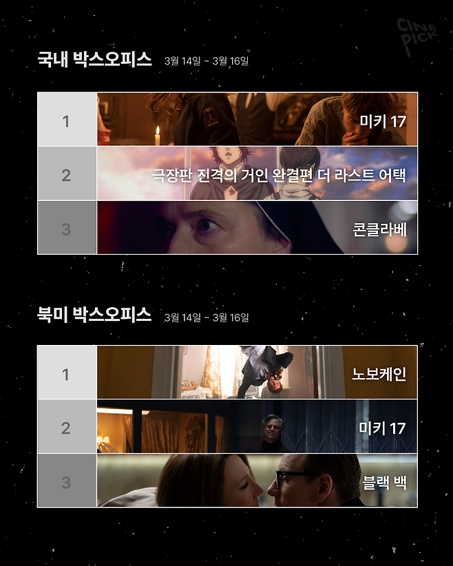 인기 애니메이션을 극장판으로 제작한 <극장판 진격의 거인 완결편 더 라스트 어택>이 누적 관객 수 20만 명을 돌파하며 2위를, 교황 선거를 다룬 <콘클라베>가 지난주에 이어 3위에 올랐습니다.