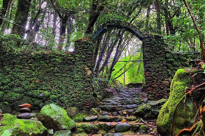 효명사는 한라산 중턱에 자리한 사찰로 우거진 숲속으로 들어서면 효명사의 산신각이 보이는데 지나서 법당 옆길 계단 쪽으로 내려가면 초록빛 이끼로 뒤덮인 아치형 문과 마주할 수 있습니다.