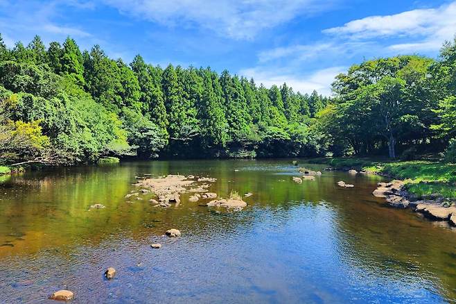 천미천은 1,100m 한라산에서부터 내려오며 제주에서 가장 넓은 면적을 자랑하고, 총 하천수가 제일 많은 하천입니다. 수많은 지류를 아우르는 수지형 하천으로 주변에 다양한 오름이 분포되어 수려한 풍광을 만나볼 수 있습니다.