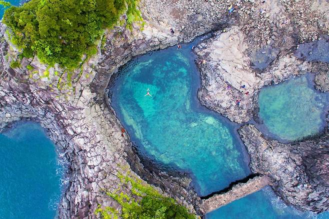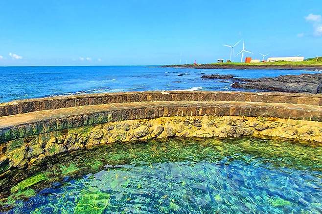 황우지해안은 바닷가 절벽 아래 자리한 천연 수영장으로 검은 현무암 낮은 담장 너머로 푸른 바다가 출렁이는 장관을 감상하며 물놀이할 수 있는 명소입니다.