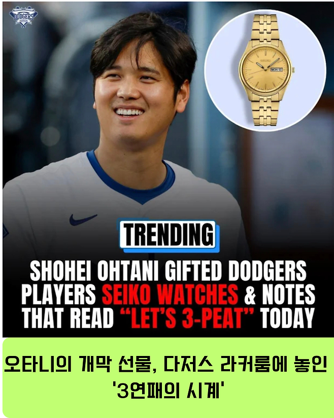 [스탠딩아웃]= 오타니 쇼헤이는 말을 길게 늘어놓는 법이 없다. 대신 그는 동료들의 손목에 직접 ‘시간’을 채워 넣으며 자신의 의지를 증명했다. 2026 시즌 개막전을 앞둔 LA 다저스 클럽하우스, 각 선수의 라커 앞에 놓인 쇼핑백 하나가 팀의 공기를 단숨에 바꿔놓았다. 그 안에는 일본 시계 브랜드 세이코의 4,000달러(약 600만 원) 상당의 손목시계와 함께 오타니가 직접 쓴 짧은 메시지가 담겨 있었다. "Happy Opening Day, LET’S 3-PEAT."