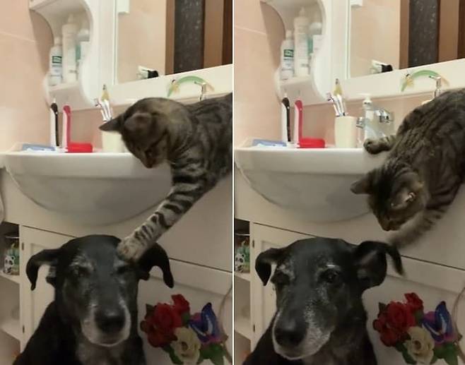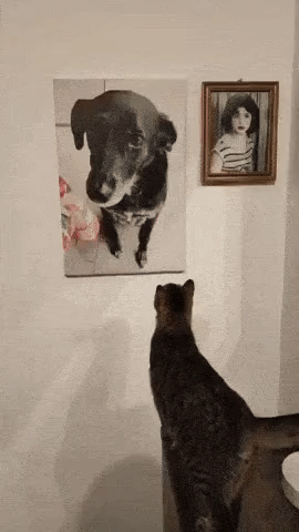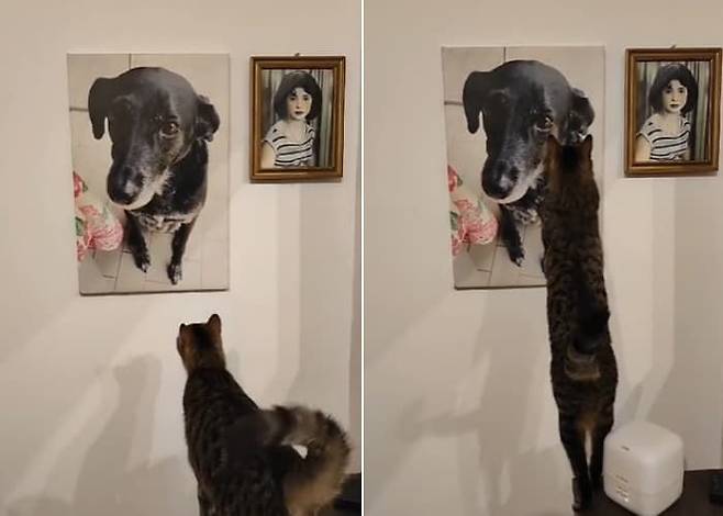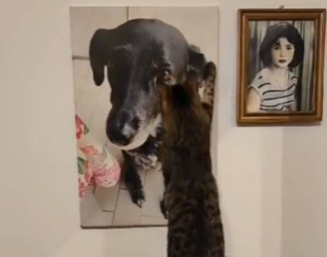 사연은 이렇습니다. 집사 아샤 쿠트리노(Asya Cutrino)는 자신의 틱톡 계정을 통해 벽에 걸어놓은 강아지 사진을 본 고양이의 모습이 담긴 영상을 찍어 공개한 것.