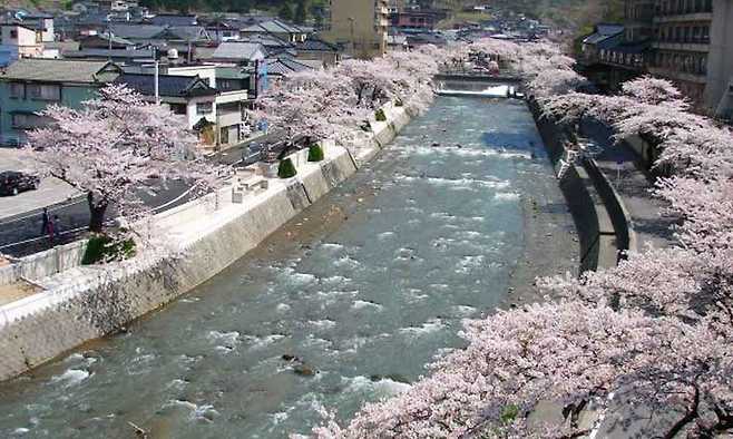 봄이 되면 아츠미 강 양옆으로 약 300그루가 넘는 벚나무에서 꽃이 피기 시작합니다. 운치 있는 풍경 속 흐드러지게 핀 벚꽃이 눈에 띄는데요. 벚꽃을 감상하며 강가를 따라 있는 무료 족욕탕을 이용할 수 있습니다. 밤이 되면 조명이 더해져 더욱 아름다운 벚꽃 야경을 감상할 수 있죠.