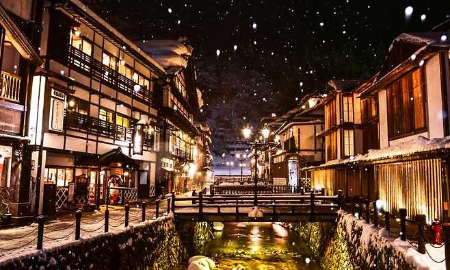 야마가타현의 대표적인 온천으로 손꼽히는 곳은 '긴잔 온천(銀山温泉)'입니다. 야마가타에서 가장 유명한 온천 마을이기도 하죠. 이곳은 무려 500년 전 은을 채굴하던 노동자들에 의해 발견됐습니다. 1920년대부터 강을 따라 목조 료칸이 생겨났고 본격적인 온천으로 자리 잡았는데요.