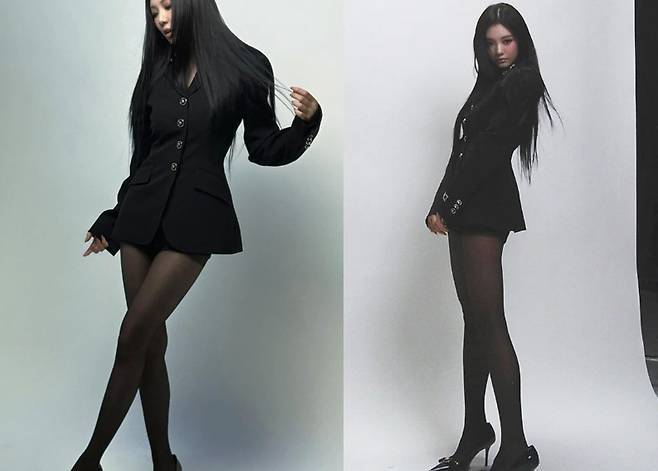 몸에 딱 맞는 블랙 재킷과 미니 팬츠를 매치해 슬림한 실루엣을 강조하며 스타일리시한 하의실종룩을 연출했습니다.