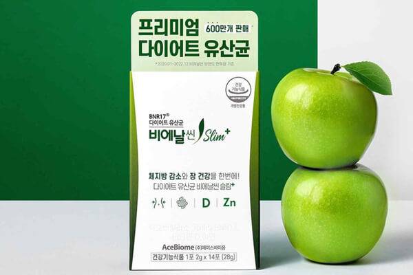 락토바실러스 가세리 BNR17은 식약처로부터 체지방 감소 기능성을 인증받은 유산균으로 알려져 있다. 비에날씬 슬림+는 100억 마리의 BNR17을 담아, 체지방 감소와 장 건강 개선을 도모할 수 있는 제품이다. 다이어트 유산균에 더해서 정상적인 면역 기능을 위한 아연, 뼈의 형성과 유지에 필요한 비타민D 등을 담았다. 입에 닿는 순간 상큼함을 느낄 수 있는 청사과 맛의 제품이다. 2주분에 해당되는 14포들이 패키지의 권장 소비자가는 35,900원이다.