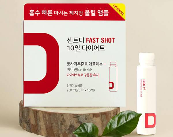 센트디 패스트샷은 하루에 한 번씩 마시는 다이어트 앰플이다. 기능성 원료를 농축해 체내 흡수가 빠르도록 마실 수 있는 형태로 만들었다. 식약처에서 기능성을 인정받은 원료를 이용해 안전한 포뮬러를 사용했다. 야생 풋사과의 폴리페놀 성분을 압축하고 가공한 애플페논을 활용했는데, 1병에 야생 풋사과 45개에 해당되는 폴리페놀인 372㎎을 담았다. 10병들이 패키지의 공식몰 판매가는 30,000원이다.