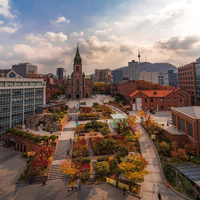 명동성당 언덕길과 남산 입구까지 이어지는 가로수길은 늦가을의 정취와 함께 사진 명소로 사랑받는다.
