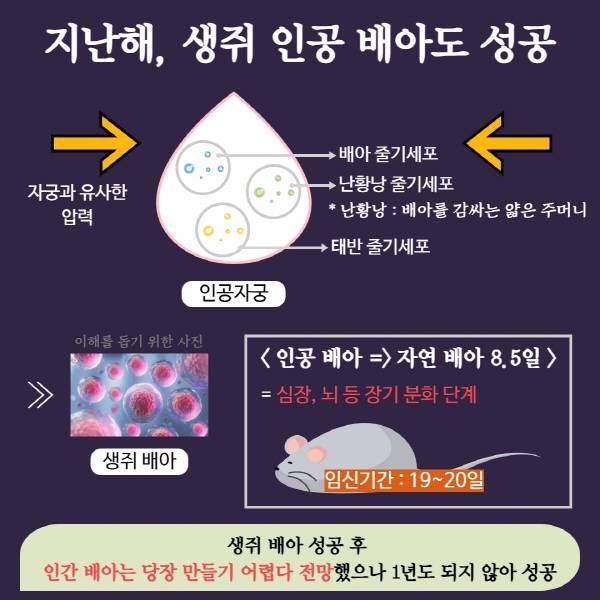 생쥐 인공 배아는 연구진이 인공 자궁에 주입한 배아 줄기세포, 난황낭(배아를 감싸는 얇은 막) 줄기세포, 태반 줄기세포의 상호작용으로 만들어졌다.