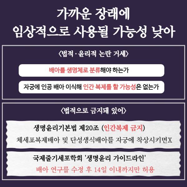 다만 가까운 장래에 합성 배아가 임상적으로 사용될 가능성은 낮다. 법적으로 연구실에서 배아를 배양할 수 있는 기한은 14일까지이며, 이후에는 임산부 검사 촬영본을 관찰하거나 기증된 배아를 연구해야 하기 때문.