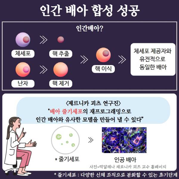 국제 연구진이 정자와 난자의 수정이 아닌 줄기세포를 이용한 합성 인간 배아를 만드는데 성공했다. 이를 두고 논란이 거세지고 있다.