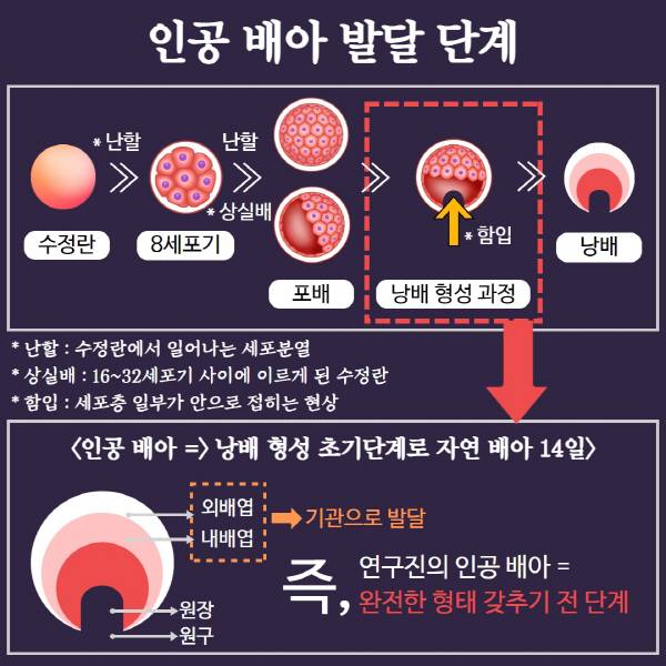 제르니카 괴츠 교수는 회의에서 합성 인간 배아가 자연 배아의 14일에 해당하는 발달단계를 약간 넘어서는 정도라고 설명했다. 이는 난자의 난할이 되는 상태인 ‘배반포 단계’에 해당한다. ‘배아 줄기세포’에서 키워낸 모델 구조가 낭배 형성의 초기에까지 이르렀다는 것이다.