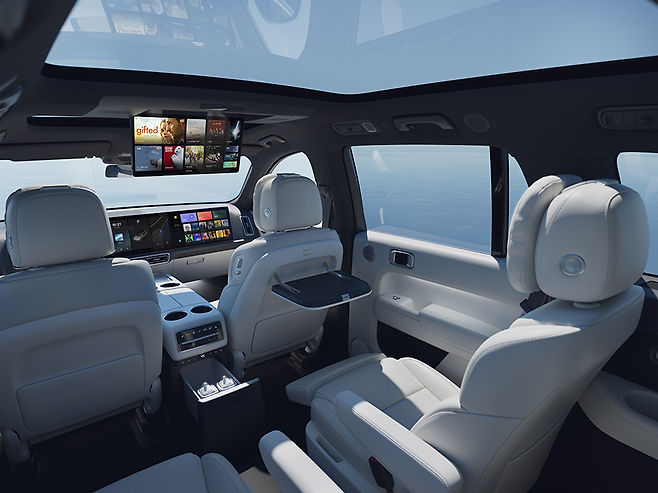 실내는 그야말로 첨단 기술의 집합체입니다. 뒷좌석에는 마사지 기능, 냉장고, 무선 충전 패드가 갖춰져 있으며, AI 음성 제어는 영어까지 인식해 기능을 제어할 수 있습니다. 키 전용 무선 충전 기능도 별도로 마련돼 있었습니다.
