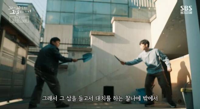 정 형사가 삽을 들고 맞서자 범인도 움찔해. 그리고 때마침, 뒤따라오던 형사들이 도착했어. 그제야 놈은 포기한 듯 두 손을 머리 위로 들었어.