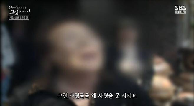"사형 좀 시켜줘요! 왜 그런 사람을 살려가지고 몇 사람의 생명을 앗아가게 해요. 그런 사람들을 왜 사형을 못 시켜요. 여러 사람 죽이고 이 모양을 만들어놔."