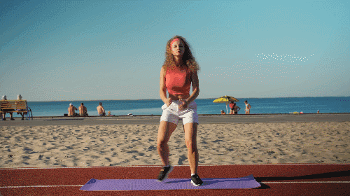 매트 위에서 시작합니다. 왼발을 왼쪽으로 이동시키며 오른발을 끌어옵니다. 이때 손은 옆구리로 모았다가 손바닥을 마주칩니다. 이어서 오른발을 오른쪽으로 이동시키며 왼발을 끌어오는 동작을 반복합니다.