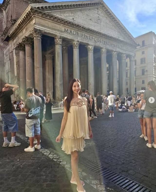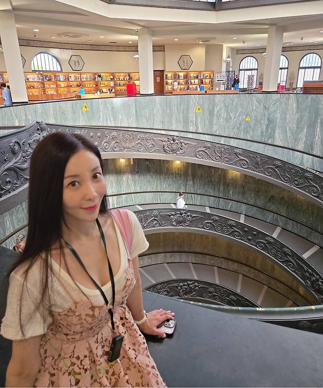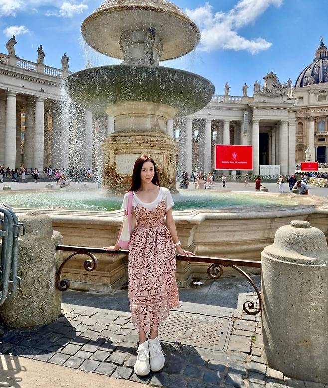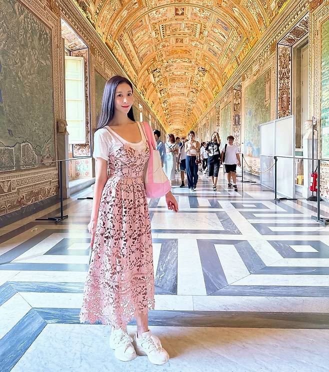 또한 바티칸 시국 투어에서는 레이스 디테일이 돋보이는 핑크 롱 원피스를 선택했습니다.