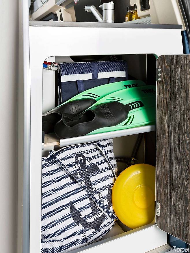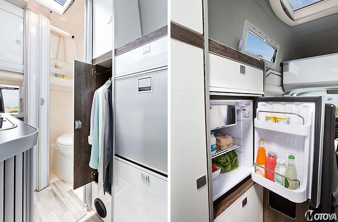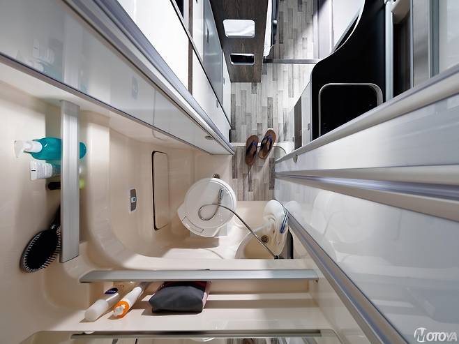 그리고 운전석측 최후미에는 화장실이 위치하고 있다. 그것도 이동식이 아닌, 고정식 변기를 사용하는 '갖춰진' 화장실이다. 고정형 변기는 각도를 바꿀 수 있어 체형에 관계없이 사용이 가능하며, 폴딩도어를 이용해 샤워부스로도 활용할 수 있다. 화장실 내부에도 선반이 마련되어 샤워용품 등 자잘한 물건들을 수납할 수 있다. 아울러 내부에는 작은 세면대도 마련되어 있다.