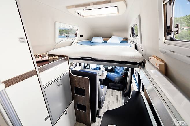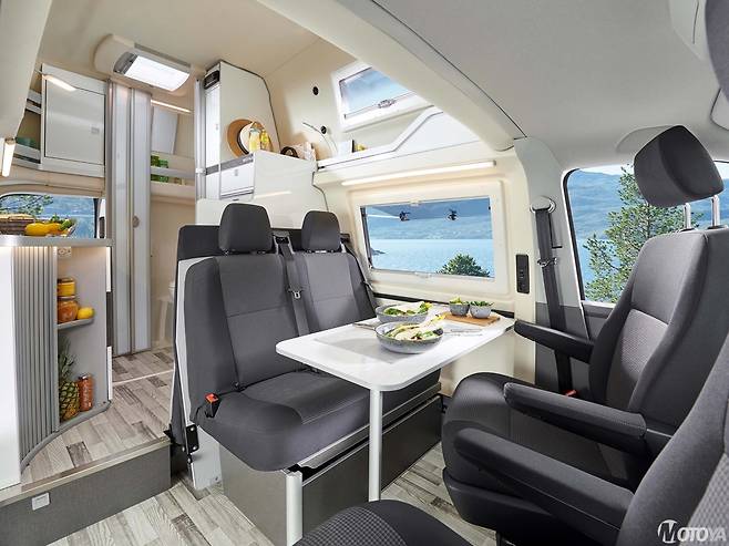 차내는 운전자 포함 4명의 승객이 탑승할 수 있다. 그리고 1열좌석은 회전시켜서 2열좌석과 연계된 거실 공간으로 활용이 가능하다. 또한 밴을 기반으로 제작되는 까닭에 2열좌석의 창은 대형의 RV용 창을 설치하고 있다. 또한 하이루프를 적용하고 있는 덕분에 고정적으로 높은 실내높이를 확보하고 있는데다 하이루프쪽에도 창을 추가로 설치하고 루프창까지 설치되어 카라반이 부럽지 않은 개방감을 경험할 수 있다.