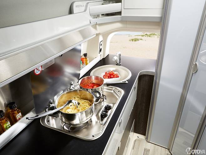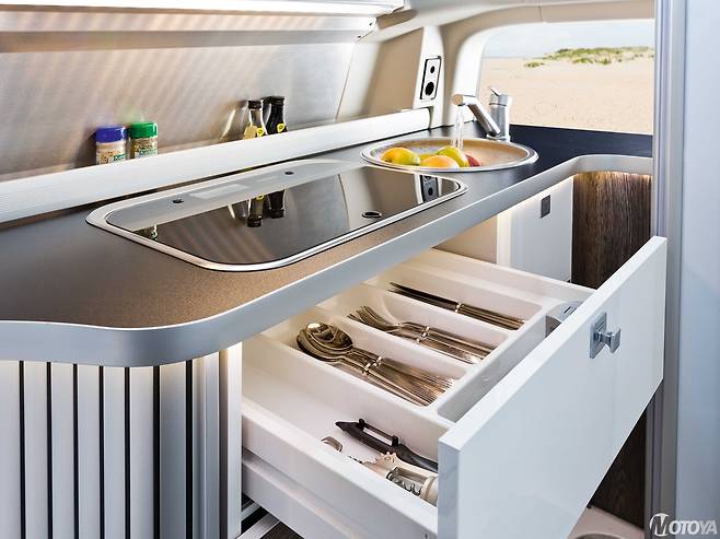 그렇다면 차체 후방에는 어떤 시설들이 자리하고 있을까? 가장 먼저 눈에 들어오는 것은 바로 주방이다. 주방에는 2구 가스레인지와 소형 개수대, 수전, 그리고 수납공간들로 구성되어 있다. 주방은 캠퍼밴으로서는 상단한 수준의 상판을 확보하고 있다.