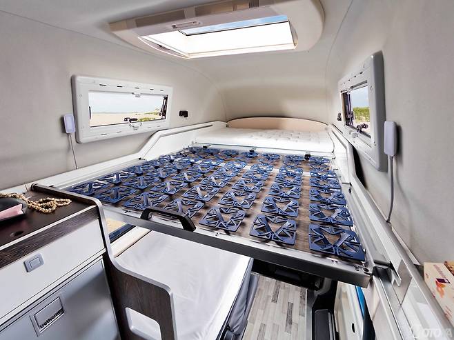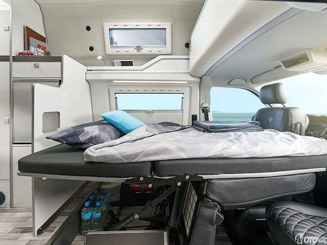 그리고 이 거실공간은 약간의 절차를 거치면 성인 2인이 취침할 수 있는 침실로 변환시킬 수 있다. 테이블을 걷어내고 2열 좌석을 전방으로 젖히는 방식으로 간단하게 변환할 수 있다. 그리고 침대로 변환한 이후에 좌석 하단의 공간을 수납공간을 활용할 수 있다.