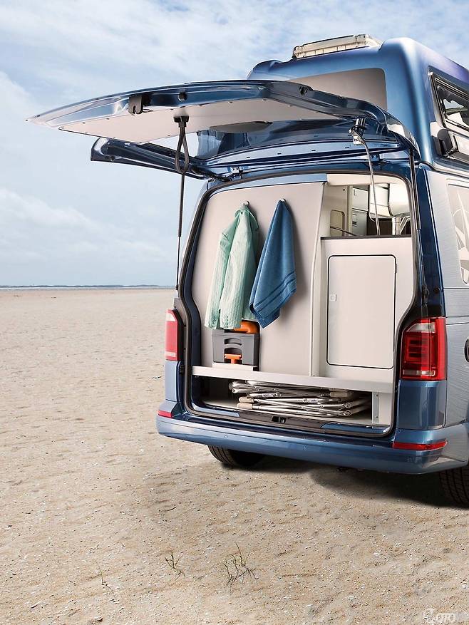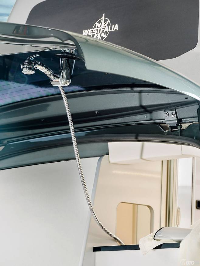 이 뿐만 아니라 웨스트팔리아 클럽 조커는 테일게이트 뒤쪽 공간도 유효하게 활용할 수 있도록 했다. 테일게이트를 열어 뒤쪽을 휴식공간으로 사용할 수 있을 뿐만 아니라 화장실의 샤워기를 바깥으로 빼내서 외부에서도 사용할 수 있다. 그리고 이쪽을 통해 화장실 카트리지를 빼낼 수 있다.