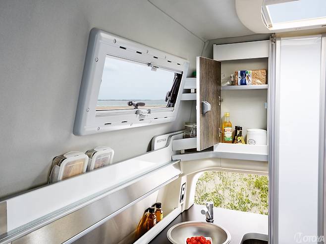 이 뿐만 아니라 비좁은 차내 공간을 손실 없이 활용하기 위해 내부 곳곳에 선반을 두어, 작은 틈 하나하나까지 수납공간으로 활용하고 있다. 상부에도 수납장을 설치해 다양한 식자재를 보관할 수 있도록 했다. 또한 주방 내부에는 LED 간접조명을 적용했다.