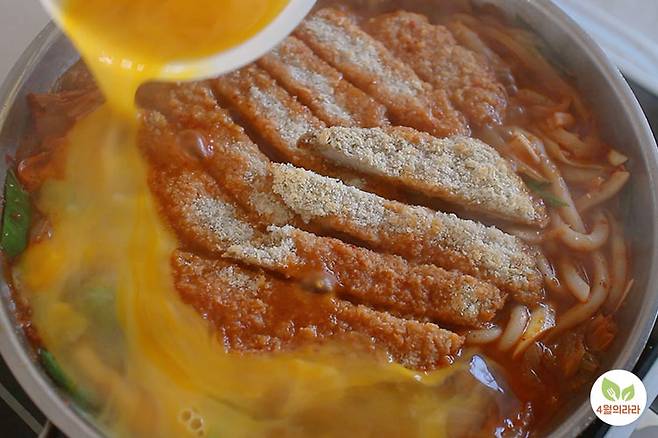 → 자른 돈가스를 올리고, 풀어둔 달걀을 가장자리로 부은 뒤 뚜껑을 덮는다.