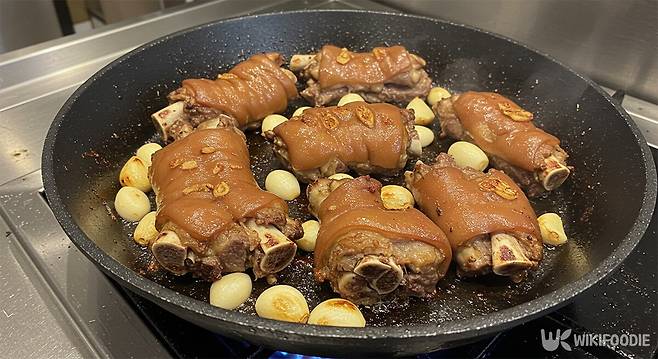 전체적인 맛은 중식 족발 조림에 가깝다. 노두유와 향신료가 들어가 깊고 진한 풍미가 나온다. 족발 특유의 탱글한 식감은 그대로 살아 있고, 삶지 않아 기름기도 덜하다. 두 번에 나눠 넣는 화자오는 잡내 없이 향을 살리는 역할을 한다. 초반엔 국물 전체에 퍼지게 하고, 마지막엔 향을 끌어올리는 용도다. 진간장은 사용하지 않는 것이 좋고, 대파는 반드시 통으로 넣어야 한다. 졸이는 시간은 반드시 지켜야 색과 농도, 풍미가 일정하게 맞춰진다.