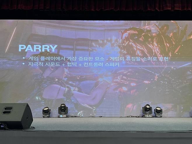 게임의 특징과 맞물린 사운드와 관련된 구체적인 사례로는 패리를 들었다. '스텔라 블레이드'의 핵심적인 액션으로 패리할 때 상쾌하면서도 자극적인 소리를 다각도로 느낄 수 있도록 노력했다면서 이를 위해 패리할 때 다른 소리의 볼륨을 줄임으로써 이를 극대화하거나 햅틱이나 듀얼센스 컨트롤러의 스피커에서도 소리가 나오도록 하는 등의 시도를 했다고 설명했다.